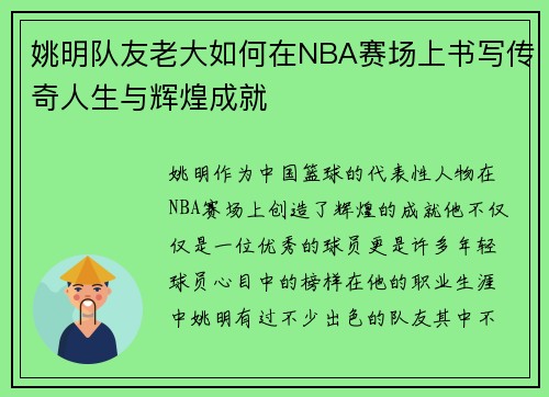姚明,这位中国篮球巨星不仅在球场上留下了辉煌的足迹,更在退役后积极投身于体育事业,影响力遍及全球。本文将从姚明的职业生涯、社会责任感、体育产业的发展以及国际文化交流四个方面,深入探讨他的追梦之路与全球影响力。在职业生涯中,他以出色的表现征服了无数球迷,并成为NBA历史上最具代表性的外籍球员之一。与此同时,姚明始终关注社会问题,通过各种慈善活动和公益项目展现出强烈的社会责任感。此外,他对中国体育产业...